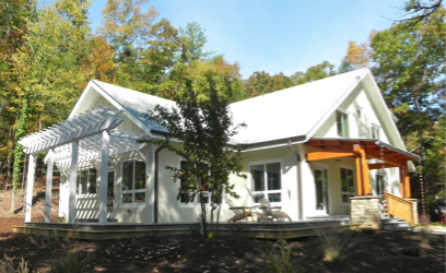 This house will be the second certified Passive House in North Carolina (certification pending). Like the Kenmore Road Residence, it uses dramatically less energy to heat and cool than a typical new house, but uses an Energy Recovery Ventilator to continually introduce fresh air. The front porch and deck have a view to the lake.